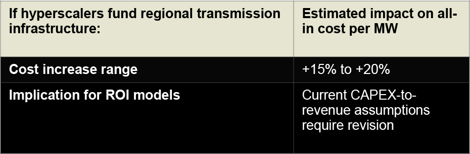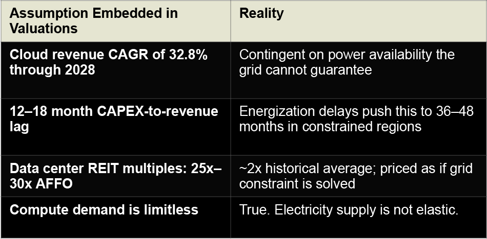 A hyperscaler that commits $5 billion to a facility in 2025 and cannot draw full power until 2028 has created a non-productive asset that sits on the balance sheet without generating the revenue the valuation model assumed. The CAPEX is real. The return on that capital is deferred. The multiple does not reflect the deferral.