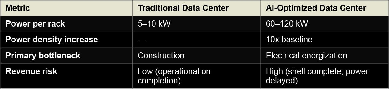 This is not a linear scaling challenge. A building that physically exists, has been constructed, and appears on a balance sheet as a capital asset, may still be unable to generate revenue because the electrical infrastructure required to bring it to life does not yet exist.