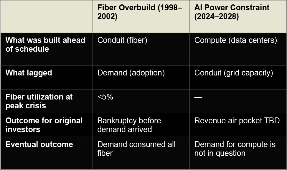 In the fiber overbuild, the conduit was built and the demand was not yet there. In the current cycle, the demand is present and accelerating—but the conduit, the grid itself, does not yet exist at the required scale.