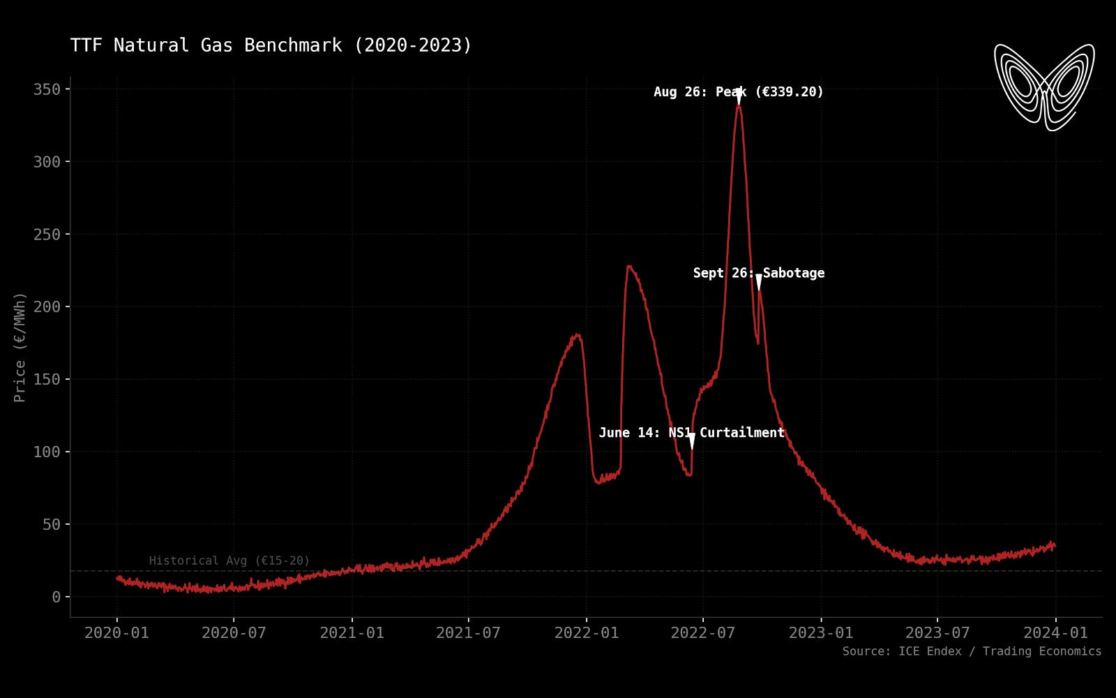 The TTF benchmark peaked at €339.20/MWh on August 26th. The historical average, 2010 through 2020, was €15 to €20/MWh.