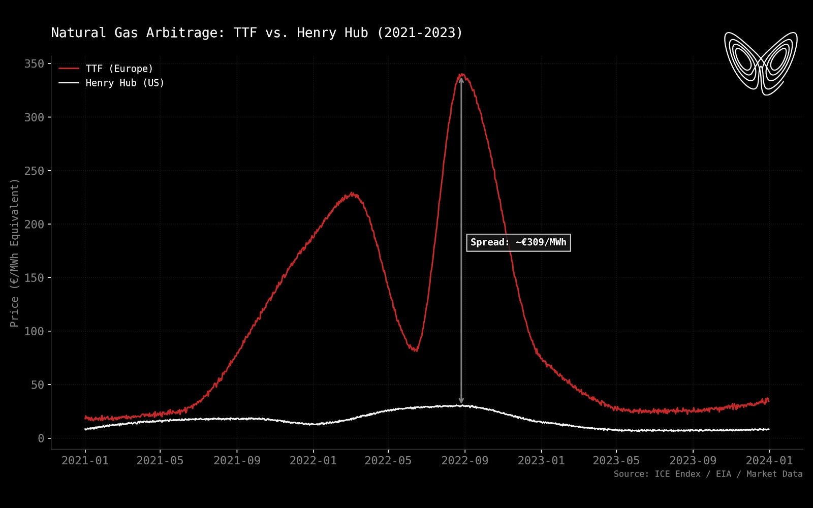 US-based nitrogen producers like CF Industries and Nutrien are no longer valued primarily on their relationship to Henry Hub natural gas. They are now the global marginal cost setters. When TTF spikes, the entire spread flows to them as profit. The trade that the consensus missed in late 2022 — long US nitrogen, short European manufacturers — was a direct play on permanently diverged input costs. It remains open.
