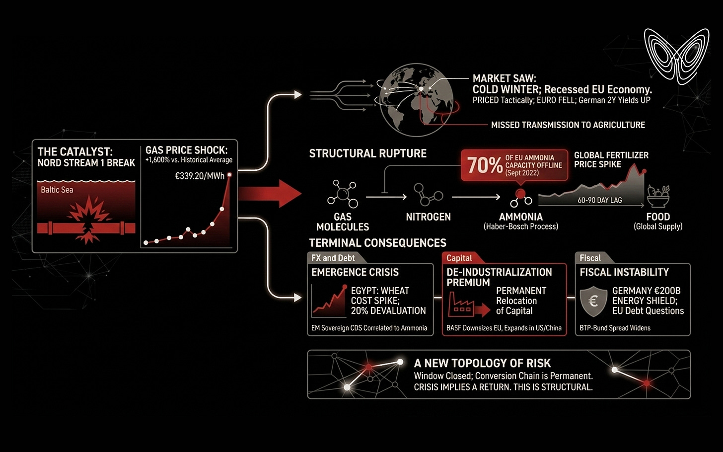 The Baltic Sea is not a regional waterway. It never was. For a brief window in the late 20th century, it was the artery through which cheap Russian molecules were converted into European industry, which was converted into global food production capacity. That window is closed.